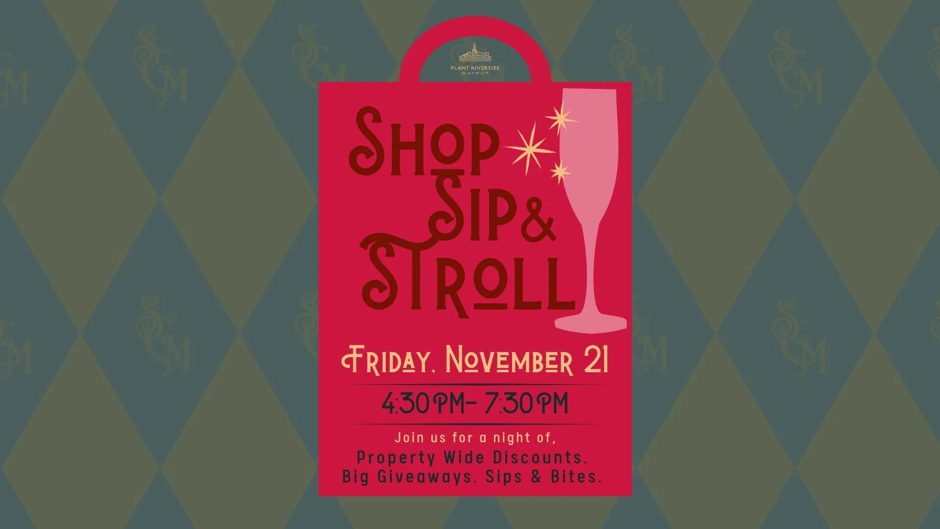 Join us for an evening of shopping, sipping, and strolling at our Shop, Sip, and Stroll retail event across the Plant Riverside Shopping District on Friday, November 21 between the hours of 4:30pm and 7:30pm! Explore exclusive deals with each retailer, find unique gifts or simply enjoy a night out with your friends, this event has something for everyone. Take advantage of special promotions and discounts from participating stores, discover new arrivals, holiday collections, and one-of-a-kind finds.