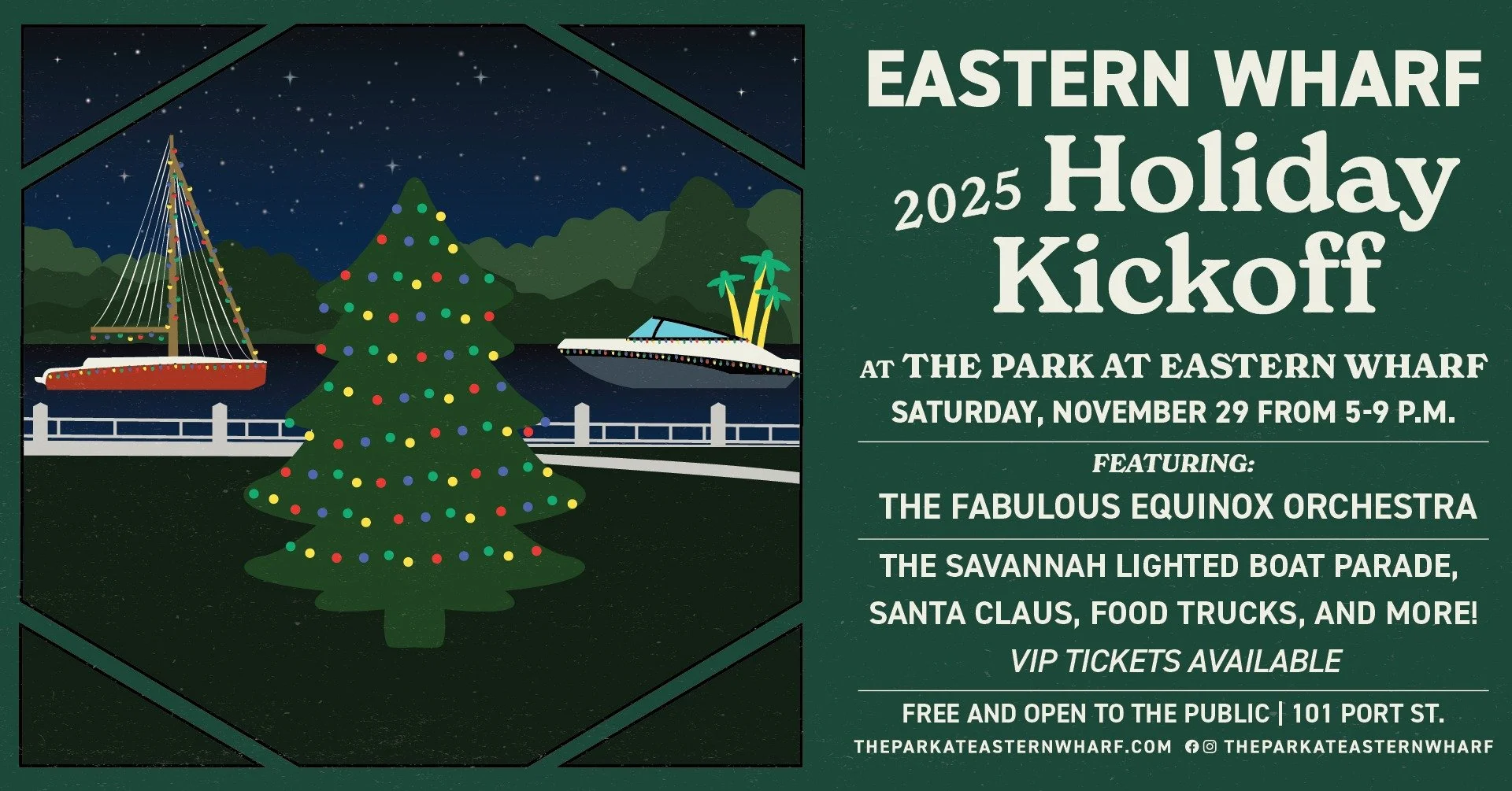 The Fabulous Equinox Orchestra and Savannah’s Lighted Boat Parade will headline this year’s Holiday Kickoff Event at Eastern Wharf from 5-9 p.m. on Saturday, November 29th, 2025 at The Park at Eastern Wharf.