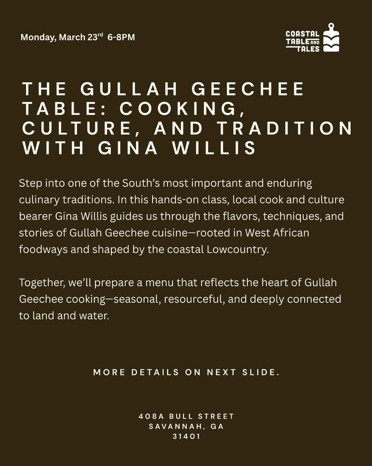 Join Gina Willis for Gullah Geechee Table: Cooking, Culture, and Tradition, an evening that explores the foodways of the Gullah Geechee people whose culinary traditions continue to shape the Lowcountry.