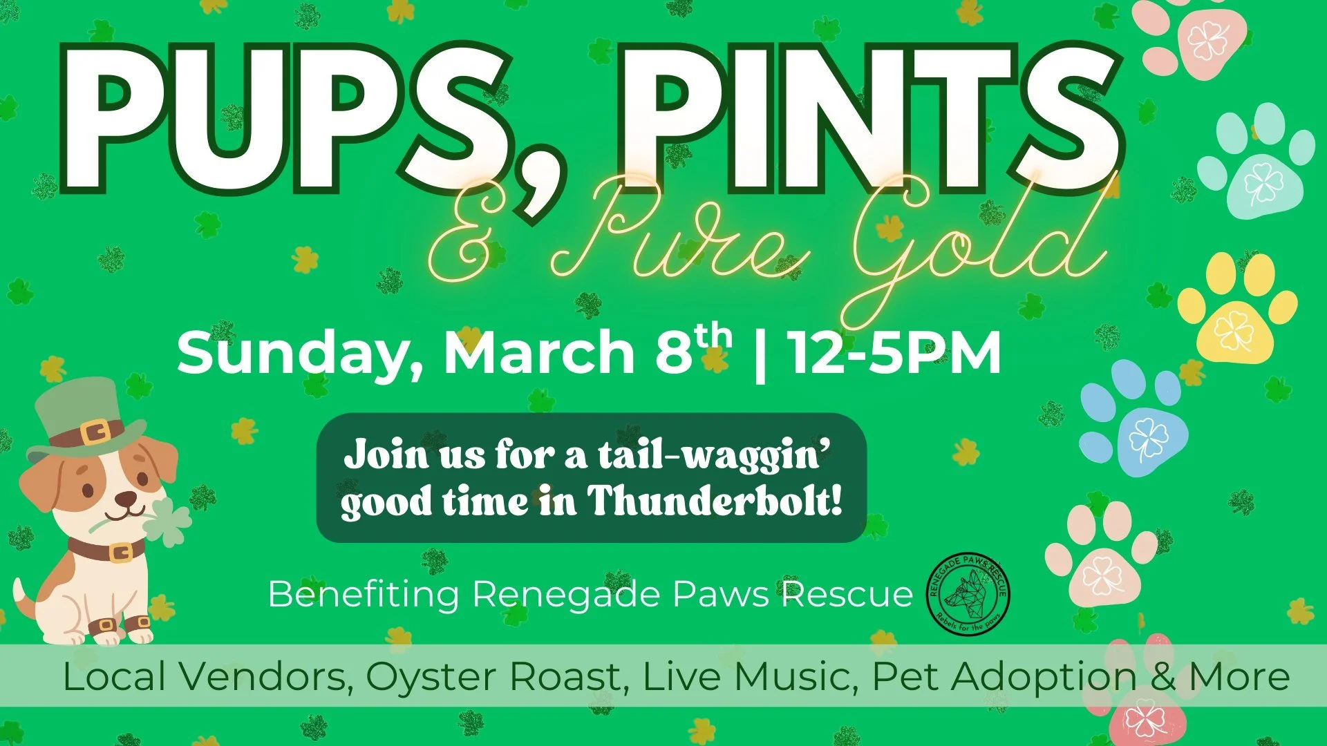 Join us March 8th from 12-5PM for Pups, Pints & Pure Gold at Tubby’s for an afternoon packed with live music , local vendors , our signature Oyster Roast , and plenty of cold beer specials to keep the party going.
