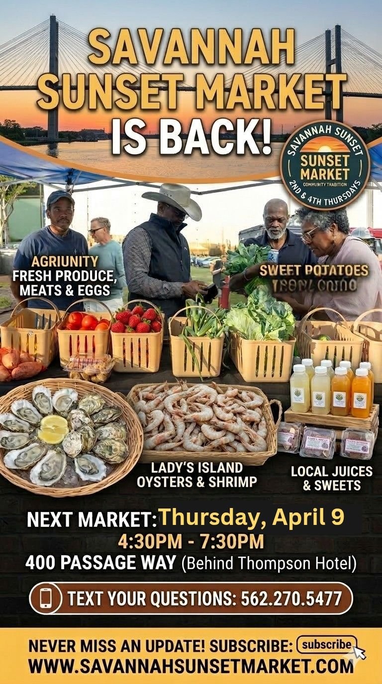 Savannah Sunset Market returns with fresh finds from local farmers and makers, food trucks, handcrafted goods, and live music as the sun goes down over the water.